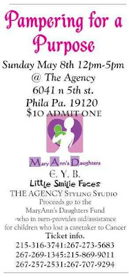 Mother's Day Pamper Party:Come out and Celebrate Memories of your Mother in a New Form on Mother's Day & Support "PAMPERING FOR A PURPOSE" on Sunday May 8th @ The Agency From 12-5PM! FOOD, BEVERAGES, FUN & GAMES!!!